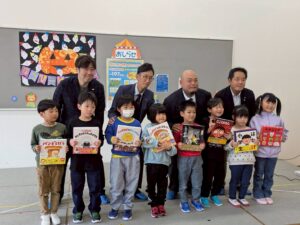 お届けした絵本を抱えて、「笑顔で記念撮影!」ありがとうございました。今後も、子どもたちが楽しいを育てることのできる環境づくりを地域の皆さんと協力し、進めていける活動に努めてまいります。