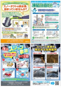 特に、屋根からの落雪やスノーダクトの排水溝詰まり。水道管の凍結破裂や自動車の路面凍結によるスリップ事故などは毎年多くの被害をもたらしています。